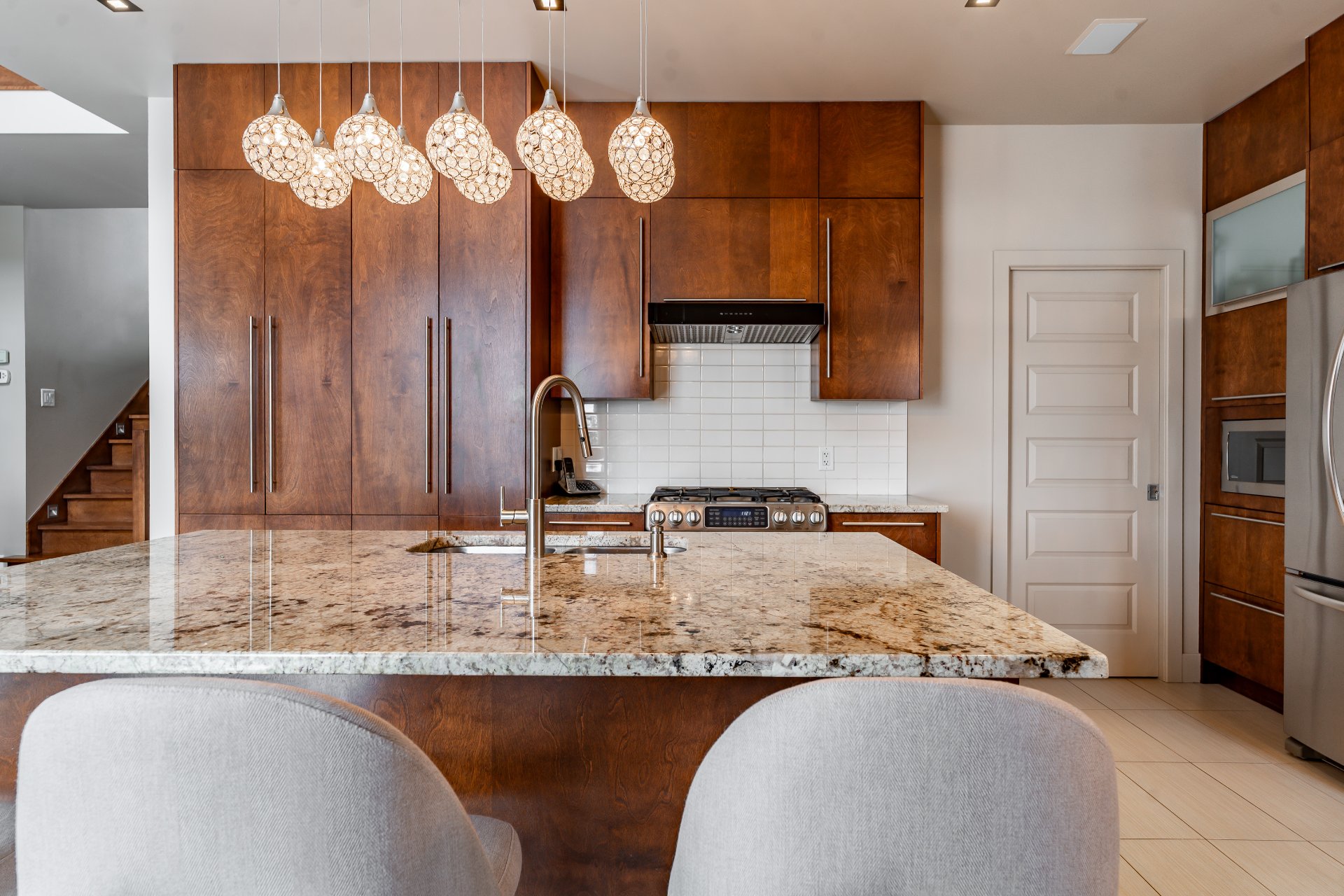 Vous accédez ensuite à un espace de vie impressionnant à aire ouverte, baigné de lumière naturelle, regroupant le salon avec foyer au bois, la salle à manger, une salle d'eau ainsi qu'une grande cuisine ergonomique offrant beaucoup de rangement, incluant un garde-manger, et complétée par un coin repas.