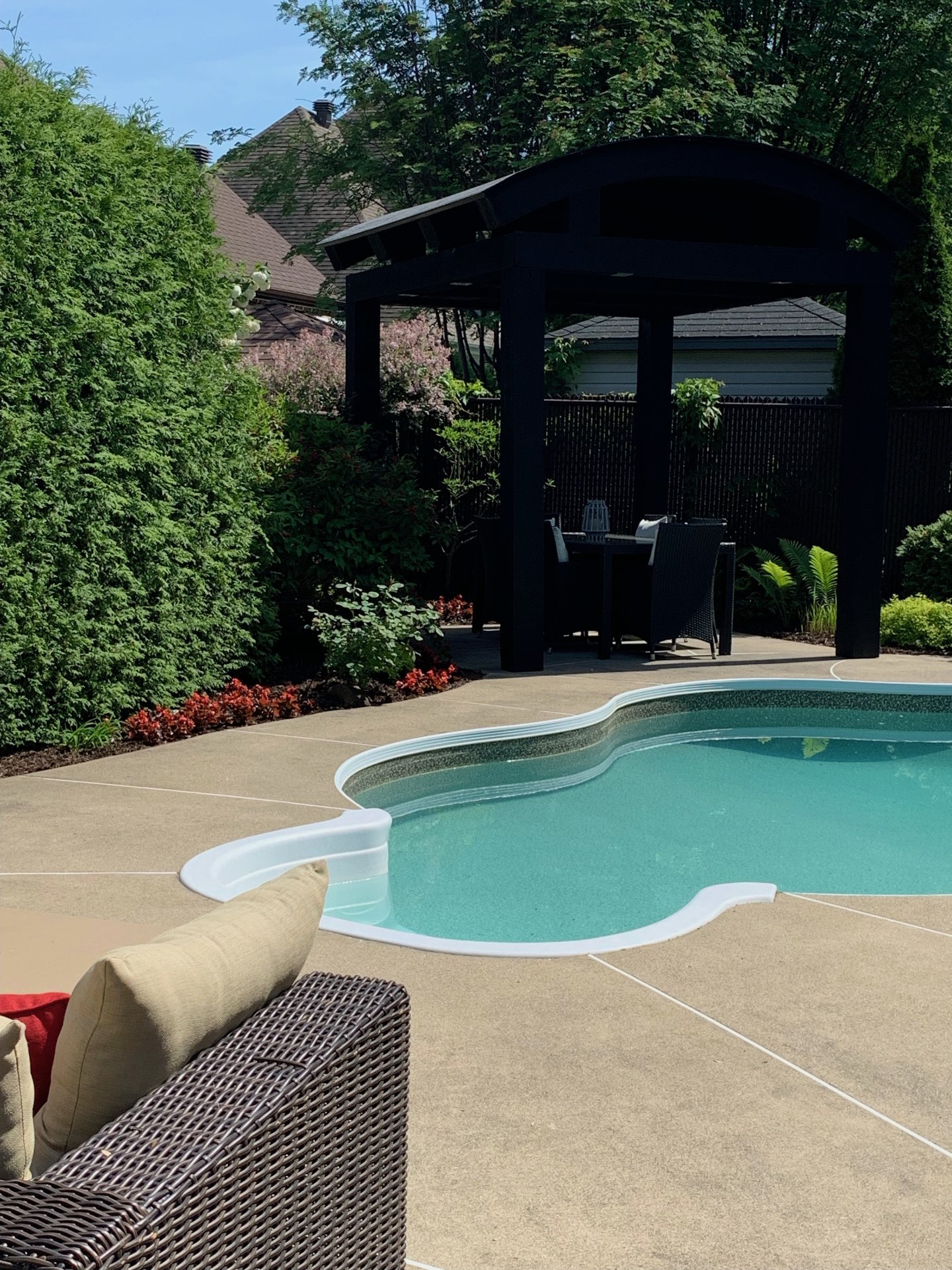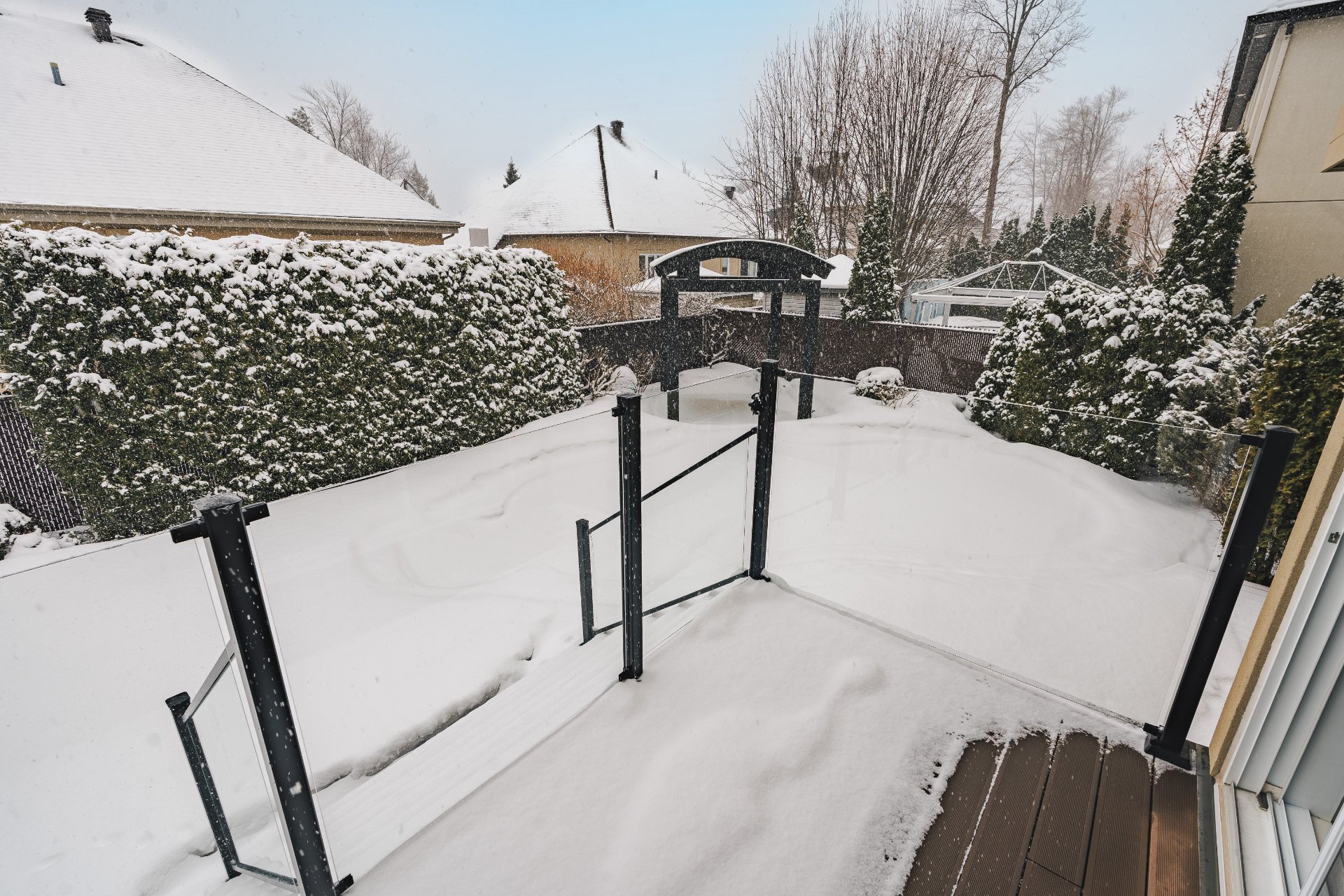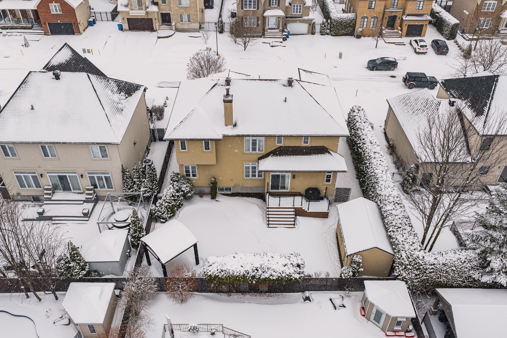 La propriété comprend trois garages, dont un garage indépendant situé dans la cour. L'allée avant permet de stationner plusieurs véhicules. À l'arrière, la cour aménagée, bordée de haies pour plus d'intimité, propose une terrasse de qualité, plusieurs espaces de détente, une piscine creusée ainsi qu'un coin repas accompagné d'une pergola.